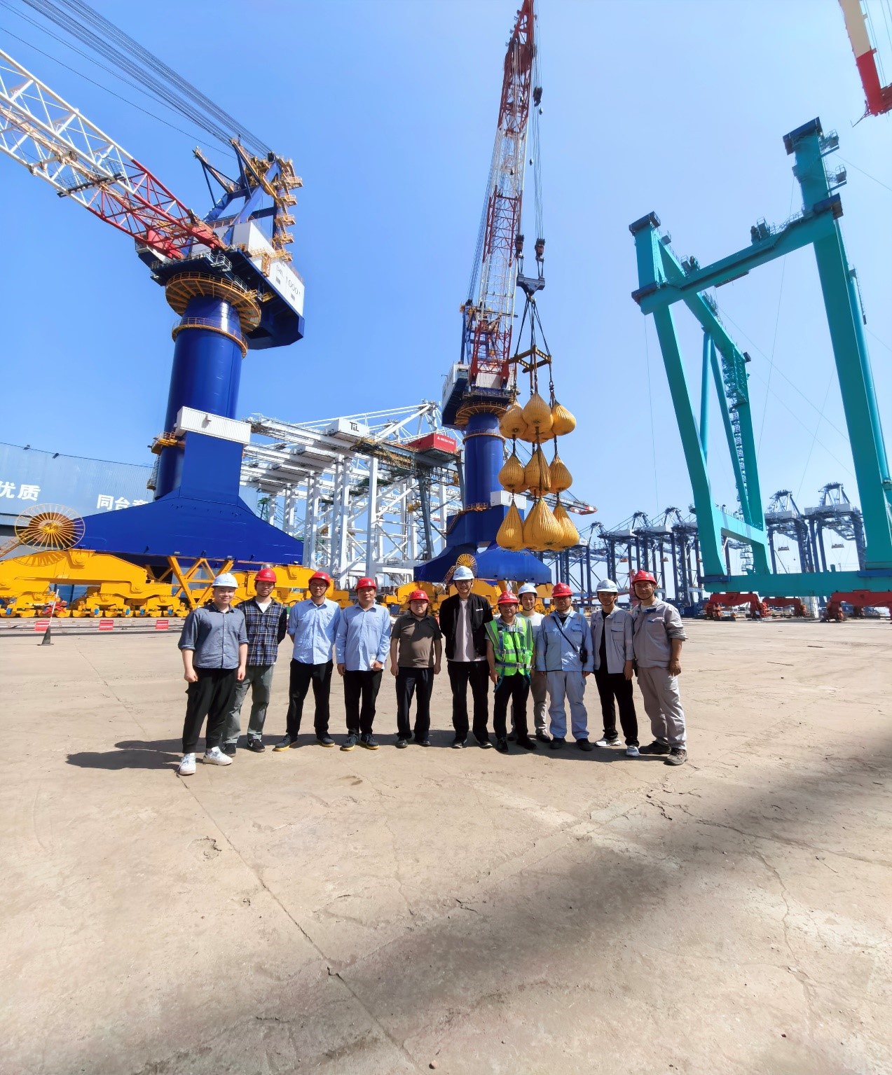 现场天气变幻莫测,时而酷暑难耐,时而暴雨如注,给高精度的应变测试带来极大困难,一方面测试点位置危险、接线布线耗时长,同时试验采用大吨位水袋作为吊重,加水过程长达12小时,应变测试清零后,一旦吊起便无法放下重复清零,否则将导致数据失效、前功尽弃。为应对这些挑战和潜在的风险,试验团队需要实时监控场内状态,做好应急防范。试验过程中,团队成员尽职尽责、坚守岗位,以高度的责任心和专业素养,严格依据相关标准与规范,对起重机的起升、行走、回转,变幅等关键性能展开了全方位细致全面的测试,确保每一项试验项目精准完成,成功完成了设备结构强度、稳定性、起升性能、安全保护等方面的验证,确认该起重机运行稳定。